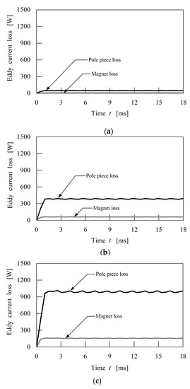 Magnets and pole piece eddy current losses with resistive load of 31 Ω at various speeds: (a) Prime speed of 100 rpm; (b) Prime speed of 300 rpm; (c) Prime speed of 500 rpm.
