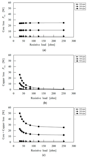 It can be observed that the eddy current losses are greater with increase in prime speed. In Figure 6a at prime speed of 100 rpm in steady state, the losses in the magnets and pole pieces are 7 W and 46 W, respectively while in Figure 6b at prime speed of 300 rpm the magnets and pole piece losses are 61 W and 384 W, respectively. In Figure 6c at prime speed of 500 rpm, the losses are 157 W and 989 W for the magnets and pole pieces respectively. It can be concluded that the losses are primarily produced in the pole pieces due to short circuiting and use of solid instead of laminated steel. The core and copper losses as a function of resistive load for various speeds are shown in Figure 7 and it can be observed that the losses are greater with increase in prime speed.