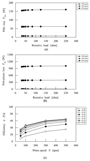 Permanent magnets and pole piece losses as a function of resistive load at various speeds with efficiency: (a) Permanent magnets losses; (b) Pole piece losses; (c) Efficiency.