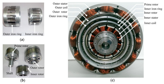 The fabricated components and assembled prototype generator: (a) Iron rings; (b) PM rotors; (c) Assembled prototype.