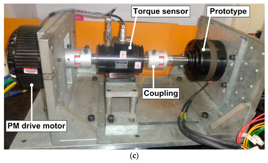 Experimental setup and test rig: (a) DC power measurement configuration; (b) AC power measurement configuration; (c) Prototype in test rig.