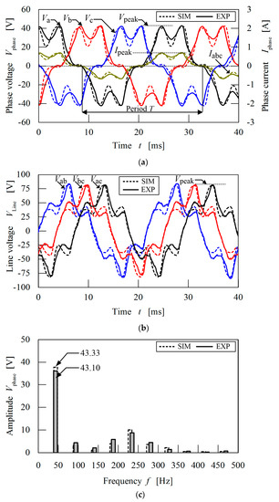 Comparison of simulated and measured output three-phase voltage and current from generator with load of 62 Ω at prime rotor speed = 200 rpm: (a) Three-phase voltage and current waveforms; (b) Line voltage waveform; (c) Fast Fourier Transform of simulated and measured three-phase voltage waveform.