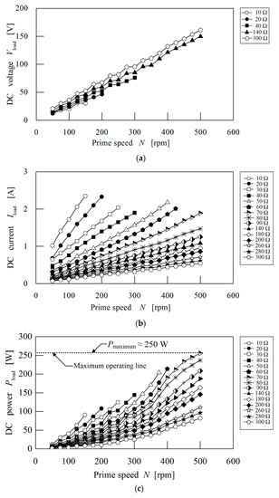 The DC power dissipated by the generator on load is measured by the product of the DC voltage and DC current and is shown in Figure 12c. The maximum DC power dissipated by the generator is ≈250 W at prime rotor speed of 500 rpm with resistive load of 70 ohm. When resistive load is increased to a maximum of 300 ohm, the DC power drops to a minimum of 87 W. At higher values of resistive load, the DC power dissipated by the MG generator is reduced.