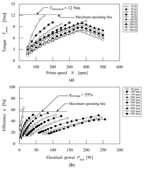 The torque/speed characteristics of the MG generator are shown in Figure 15a and the maximum torque achieved by the MG generator is ≈11 Nm with resistive load per phase of 125 ohm at prime speed of 425 rpm. It can be observed that at constant resistive load per phase, torque increases linearly with increase in prime speed while a decrease in resistive load per phase results to increase in torque. From Figure 15a at prime speed of 275 rpm–500 rpm, the torque generated on the prime shaft is constant because maximum torque has been achieved and this can be assumed as the maximum operating point of the MG generator before it slips. It is likely that losses due to significant eddy current from the iron ring pole pieces and PMs limits the transmission torque of the MG generator but an improved design using laminated pole pieces and magnet segmentation could increase its transmission torque.