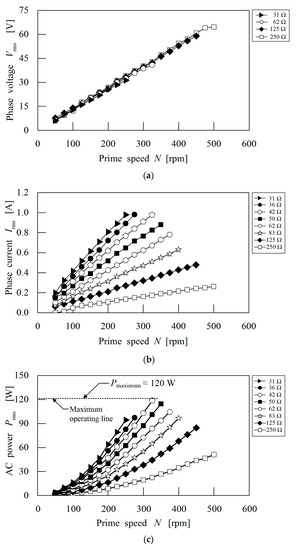 The MG generator was connected to a balanced three phase star resistive load with a range of 31–250 ohm per phase at constant prime speed, while the AC voltage, AC current and AC power characteristics were measured and recorded. The measured phase voltage Vrms is shown in Figure 14a with maximum Vrms ≈ 65 V at prime speed of 500 rpm and resistive load per phase of 250 ohm. It can be observed that there is a linear relationship between phase voltage and prime speed of the MG generator. From prime speed 475–500 rpm the phase voltage is constant at maximum resistive load per phase of 250 ohm because the MG generator has reached saturation point. Also at minimum resistive load per phase of 31 ohm, the maximum phase voltage generated is ≈31 V at maximum prime speed of 375 rpm and the MG generator slips when the prime speed is increased. This is because the counter torque produced from the generator is greater than the torque generated by the MG. Although other resistive loads of 36, 42, 50 and 83 ohm display the same linearity trend but only four values of resistive load per phase are shown in Figure 14a to ensure clarity of the graph. Similarly, it can be observed in Figure 14b that there is also a linear relationship between phase current and prime speed of the MG generator. The maximum phase current produced is ≈1 A, at prime speed of 250 rpm and minimum resistive load per phase of 31 ohm. At maximum resistive load per phase of 250 ohm the maximum phase current produced is ≈0.26 A, at prime speed of 500 rpm. The graph shows that at resistive load per phase of 42 ohm, the maximum phase current drops with increase in resistive load. This means that the MG generator has reached saturation point and at prime speed of 500 rpm the MG generator slips due to the counter torque from the generator greater than the MG.