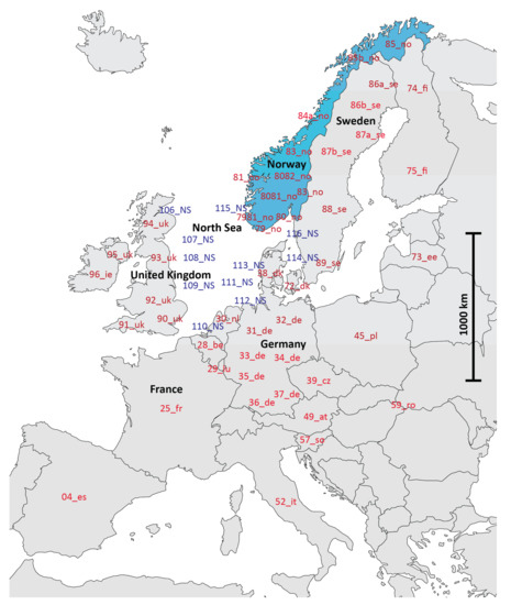 Figure 1 shows the 59 nodes/regions used in the EMPS analysis. The red text is nodes representing aggregated onshore production and consumption in the power system analysis with the EMPS model. The blue text are nodes representing aggregated offshore wind power production. The black text is only for additional information to the reader and are not used in the EMPS analysis. Each node has an endogenously determined internal supply and demand balance with distinct import and export transmission capacities to the neighboring nodes. Appendix A shows the assumptions about installed production capacities, demand and transmission capacities for each of the nodes in the figure. Appendix B shows the energy balance for each of the nodes. As shown in the figure, the Nordic countries, UK and Germany are modelled with several nodes, while Southeastern Europe is aggregated to one node (59_ro in Figure 1). The hydropower in the Nordic area include complex river systems with multiple power plants in series or parallel with 75 years of historical hydrological inflow data. Each hydropower plant and each reservoir is modelled in detail. Except for Sweden, the other European countries use a simpler hydropower model.