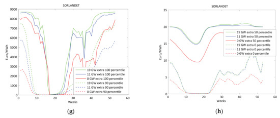 Water values for the four regions in Norway with increases in generation capacities. (a,c,e,g) shows the 100 and the 90 percentiles while (b,d,f,h) shows the 50 and 0 percentiles.