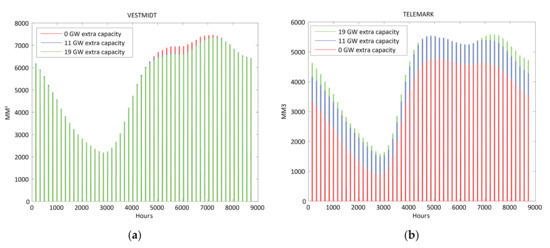 Previous research identified possibilities for increased generation capacity in existing hydropower plants in Southwestern Norway. Reference [8] focused on the possibilities for increasing capacity with minimal environmental impact. No new or expanded reservoirs were assumed. Furthermore, present regulations regarding highest and lowest regulated water levels were also kept unchanged. Two possible cases for increases of capacities were identified, one case with 11.7 GW increased production capacity and 4.5 GW pumping capacity and another with 19 GW increased production capacity and 9.2 GW of pumping capacity. The power generation outputs in the two cases were mainly chosen such that the water level changes in the reservoirs did not exceed 13 cm/h at maximal production. According to research into the stranding of salmon in rivers, the water level should not sink by more than 13 cm/h [24]. Although this is not directly applicable to lakes, this was used as a rule of thumb for acceptable water level reductions in reservoirs.
