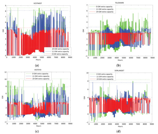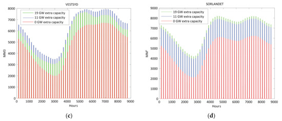 Production hour-by-hour for the four regions in the 38th simulation year): (a) VESTMIDT; (b) TELEMARK; (c) VESTSYD; (d) SORLANDET.