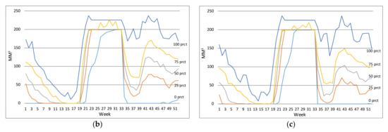 Percentiles (0, 25, 50, 75, 100) reservoir level week-by-week over the year for Kvilldal (max 237 MM3): (a) Present hydropower generation capacity (0 GW extra); (b) 2 GW extra capacity in plant downstream to the reservoir (11 GW extra in Norway); (c) 3.4 GW extra capacity in plant downstream to the reservoir (19 GW extra in Norway).
