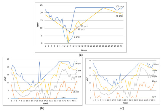 Percentiles (0, 25, 50, 75, 100) reservoir level week-by-week over the year for Lysebotn buffer reservoir (max 23.3 MM3): (a) Present hydropower generation capacity (0 GW extra); (b) 1.4 GW extra capacity in plant downstream to the reservoir (11 GW extra in Norway); (c) 1.8 GW extra capacity in plant downstream to the reservoir (19 GW extra in Norway).