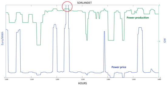 Price (blue curve) versus hydropower production (green curve) SORLANDET (11 GW extra capacity case) year 38, hour 1100 to 1400.