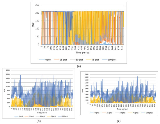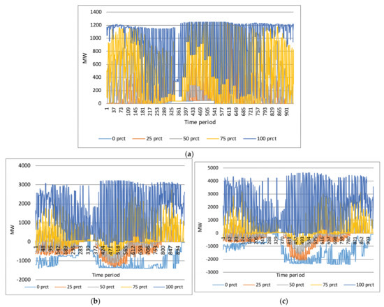 Percentiles (0, 25, 50, 75, 100) for production time step-by-time step over the year for Kvilldal: (a) Present generation capacity of 1.2 GW (0 GW extra); (b) 2 GW extra capacity for Kvilldal plant (11 GW extra in Norway); (c) 3.4 GW extra capacity for Kvildall plant (19 GW extra in Norway).