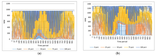 Percentiles (0, 25, 50, 75, 100) for production for Tonstad time step-by-time step over the year: (a) Present capacity 1.0 GW; (b) 1.1 GW extra capacity (11 GW extra in Norway)