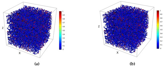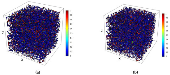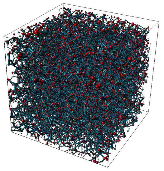 A network model that was obtained from the reconstructed Berea sandstone was established [49]. The network model size was 3 mm × 3 mm × 3 mm, as shown in Figure 3. The sphere and rod represent pore and throat, respectively. The size of the ball and rod reflect the different spatial dimensions of the whole pore and throat. It is composed of 12,349 pores and 26,146 throats. The porosity and absolute permeability are 24% and 2.5 Darcy, respectively. The basic parameters of the network simulation are listed in Table 1.