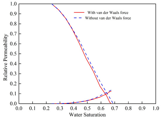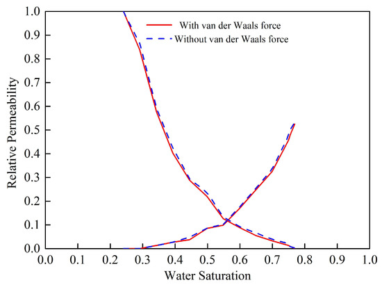 The impacts of van der Waals force on the relative permeability curve are shown in Figure 4. The isotonic point moved to the left, the oil–water simultaneous flow region decreased, and the residual oil saturation increased with van der Waals force. During the imbibition process, capillary force acted as the driving force. Van der Waals force increased the binding force of the fluid, which meant that the flow resistance between the pores increased. Oil recovery with and without van der Waals force were 57.07% and 59.48%, respectively. To be precise, the efficiency variation influenced by van der Waals force was 4.05%.
