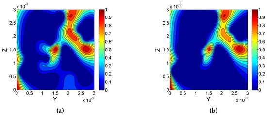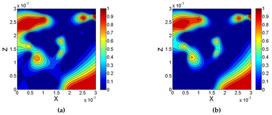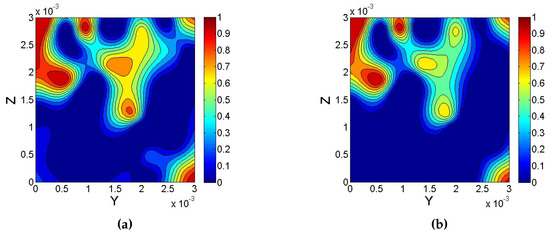 The distribution of residual oil in the network model with and without van der Waals force is shown in Figure 5. Figure 6, Figure 7 and Figure 8 show the contour maps of the residual oil saturation at different cross-sections of the X-axis and Y-axis directions with and without van der Waals forces. Due to van der Waals force, the flow resistance increased, and resulted in boosting the proportion of residual oil in the network model. Thus, the microcosmic residual oil was significantly influenced by van der Waals force; namely, van der Waals force cannot be ignored in a water-wet reservoir. These results were consistent with those obtained by Geim et al. [50], who mentioned van der Waals was no longer negligible and can compete with the capillary force in the case of hydrophilic materials.