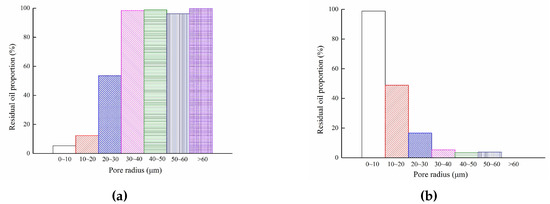 Figure 11. Effect of pore radius on residual oil distribution. (a) Water-wet reservoir; (b) Oil-wet reservoir.