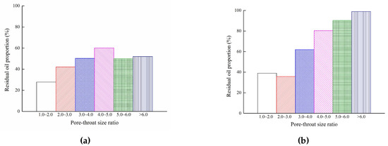 Figure 12. Effect of pore–throat size ratio on residual oil distribution. (a) Water-wet reservoir; (b) Oil-wet reservoir.
