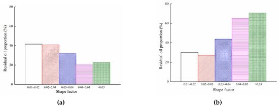 Figure 13. Effect of shaping factor on residual oil distribution. (a) Water-wet reservoir; (b) Oil-wet reservoir.