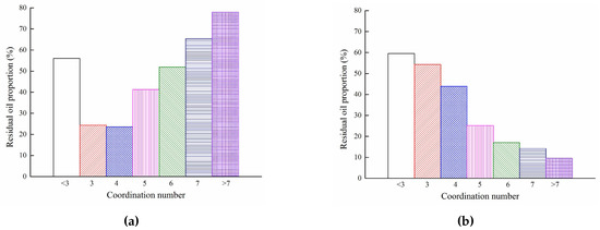 Figure 14. Effect of coordination number on residual oil distribution. (a) Water-wet reservoir; (b) Oil-wet reservoir.