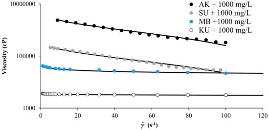 Viscosity of MB, SU, and KU heavy oils, and AK extra heavy oil in the presence of SiO2 nanoparticles at 1000 mg/L and 298 K and shear rate between 0 and 120 s−1.