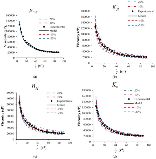 From Figure 5, the sensitivity of each parameter participating in the proposed model can be observed. Clearly, the model is less sensitive to changes in the parameter that is related to the viscosity measured at an infinite shear rate. The other parameters belonging to the model have more incidence on the viscosity calculated from the model. It can be considered that the parameters , , , and have a similar impact on the behavior of the model.