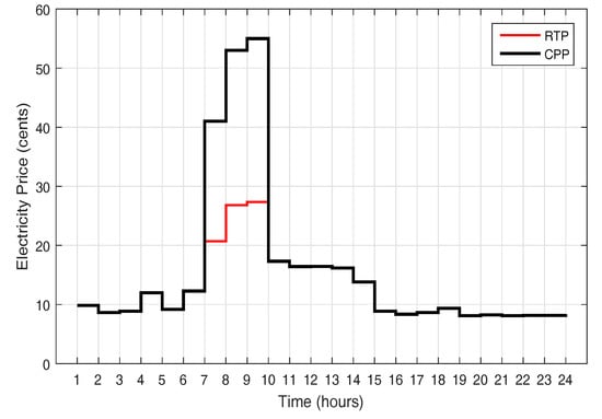 The cost is paid against the consumed electricity, which is calculated with respect to the per unit price of electricity. There are many schemes for defining per unit cost of electricity, provided by the utility to motivate consumers to manage their electricity load. Some of the pricing schemes are: ToU, CPP, IBR and RTP. In our work, RTP and CPP signals are used for electricity cost estimation, which are represented in Figure 3. The pricing scheme is represented by , for each time interval . The total electricity cost per hour for all classes is equal to the product of total load that is consumed in the particular time slot ‘t’ and the price signal in the same hour. The total electricity cost against the individual time slot for single and multiple smart homes is shown by Equations (19) and (20).