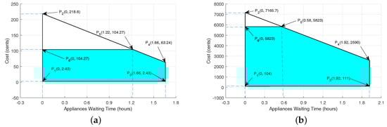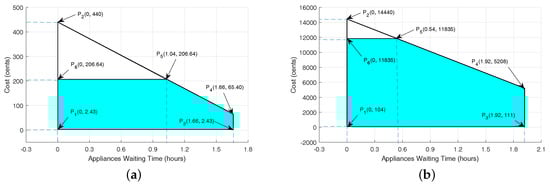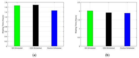 While decreasing the cost and PAR, the waiting time increases, which is shown in Figure 15a,b. However, our proposed scheme tries to minimize the user waiting time. It shows that there exists a tradeoff between electricity cost and user waiting time, and the results are explained in Table 6 and Table 7 for single and multiple smart homes, respectively. However, our proposed scheme achieves the desirable tradeoff between electricity cost and user waiting time. The waiting time of non-deferrable appliances is zero because these appliances may not be interrupted or shifted to any other time slot. Interior lighting, which is turned ON from the 18th–24th h and the length of operation of 6 h, and refrigerator, which is turned ON for 24 h, are parts of the non-deferrable appliances. Therefore, there is no waiting time for non-deferrable appliances.