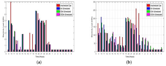 Energy cost minimization in the smart grid was targeted in [], using GA via integration of RES and storage devices, i.e., batteries. The stored electricity is used in specific time intervals when the electricity price or demand is high. Charging and discharging limits of the batteries are given by the authors, and also, a controller is installed to avoid any damage of batteries. However, the authors ignore the installation cost and maintenance expenses of RES and storage devices. The authors in [] proposed a technique to balance the load in industrial, commercial and residential areas. They compare the electricity consumption of various datasets through DSM without GA and DSM with GA (GA-DSM). The comprehensive simulation results show that the proposed strategy GA-DSM achieved the objective: reduction in electricity consumption, which is 21.91% during peak hours. However, the authors did not discuss PAR and user comfort.