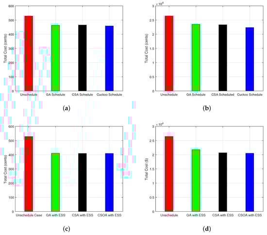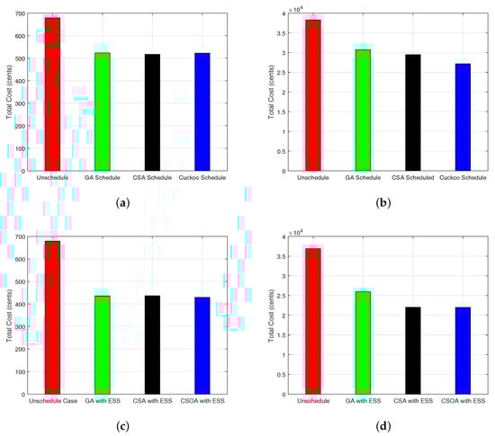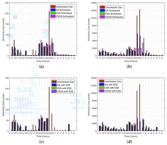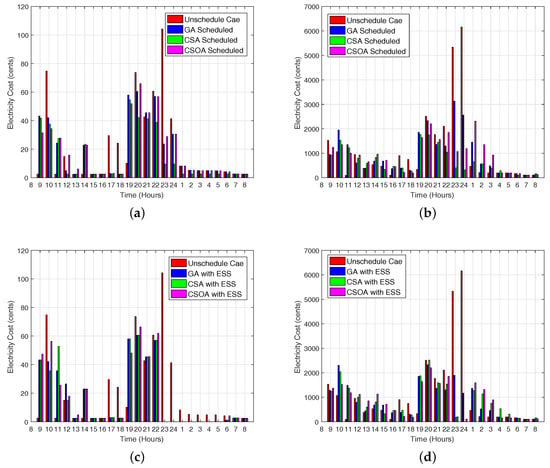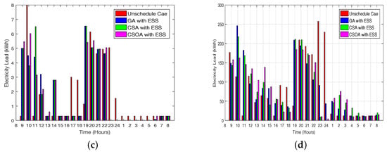 The results illustrate that the proposed scheme is able to schedule the electricity load from high price hours to low price hours while considering the minimum user waiting time and minimum PAR. The electricity cost is more reduced with the integration of ESS. Furthermore, our proposed scheme using CSOA shows supremacy in terms of cost and PAR minimization, while a desirable trade-off between electricity cost and user waiting time. The performance of CSOA is superior to CSA and GA because CSOA spent the maximum time on the global solution instead of the local solution, and there are fewer parameters to be fine-tuned than GA.