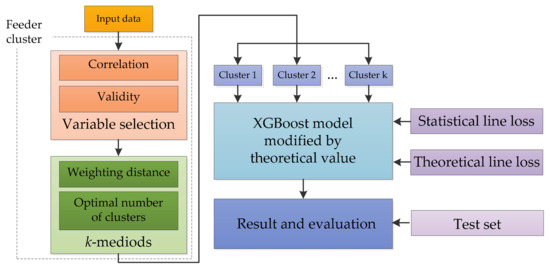In this research, eXtreme Gradient Boosting (XGBoost) is selected as the estimation method of statistical line loss of distribution feeders, since it is extensively used by scientific researchers and engineers, and has remarkable performance in many fields, such as energy and remote sensing [15,16,17,18], information technology and software engineering [19,20,21,22], biological and medical engineering [23,24,25], economy, and finance [26,27]. Except for the precise and robust model that is established in XGBoost [28], it is flexible to rewrite the objective function of XGBoost, which makes it possible to estimate statistical line loss with reference to the theoretical value. Meanwhile, in order to improve the applicability and accuracy of the XGBoost model, the thought of clustering distribution feeders [29,30,31] is applied before the estimation procedure.