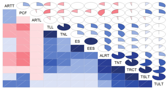 As shown in Figure 2, ARTT, PCF, and ARTL have a weak correlation with other variables. The correlation between TLL and TNL is significantly strong, as is the correlation between EES and ES. Meanwhile, TRCT is positively correlated with ALRT, TNT, TSLT, and TULT. When considering that TLL and TRCT comprise more abundant information than other correlated variables, while EES is easy to measure and more accurate compared with ES, the eliminated variables are TNL, ES, ALRT, TNT, TSLT, and TULT based on correlation analysis.
