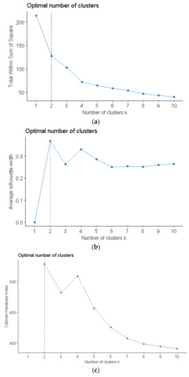 The Calinski Harabasz index is a widely used cluster validity index to evaluate the partitioning quality [35,36,37,38]. This index is defined as the ratio of the average distance between clusters and average squares error within clusters. Accordingly, the optimal number of clusters can be determined by maximizing the Calinski Harabasz index.