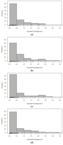 In order to evaluate the performance of XGBoost model for the estimation of statistical line loss, decision tree, neural network, and random forests are selected as a comparison. The implementation of XGBoost, decision tree, neural network, and random forests is by means of R package: XGBoost, rpart, nnet, randomForest, respectively. The dataset that was used in this study is randomly assigned to the training set (80%) and the test set (20%), while the above models are trained using the training set and the models are validated in the test set. The RMSE, MAPE of the estimation results in the test set using aforementioned methods is shown in Table 6. Figure 4 and Figure 5 show the distribution of APE of each sample in the test set by histograms. Moreover, a rug plot [44], which represents the real data values in one-dimensional is added to the plot between bar chart and axis of abscissa to display more detailed information.