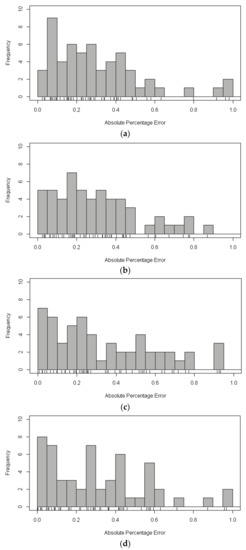 The distribution of Absolute Percentage Error (APE) of each sample in the test set of cluster 1. (a) The distribution of APE using eXtreme Gradient Boosting (XGBoost); (b) The distribution of APE using decision tree; (c) The distribution of APE using neural network; and, (d) The distribution of APE using random forests.