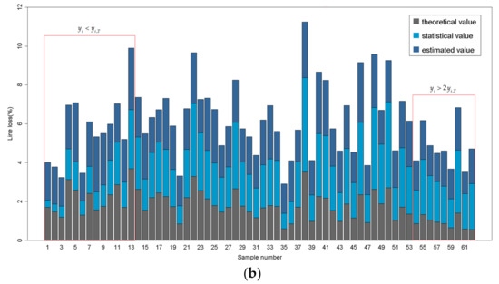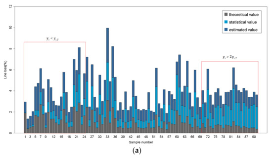 According to Section 2.3, the XGBoost algorithm that is modified by theoretical value is implemented to the estimation of statistical line loss of distribution feeders. Likewise, the dataset is randomly assigned to the training set (80%) for training the model and the test set (20%) for model validation. Figure 6 shows the estimated value, statistical value and theoretical value in the test set by means of a histogram. The samples are numbered in the order of the relative difference between statistical value and theoretical value: . As shown in Figure 6, when or , the estimated value is obtained based on both the statistical value and theoretical value. Moreover, the estimated value is more dependent on the theoretical value when the statistical value becomes farther from the reasonable scope.