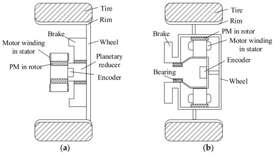 Electric wheel configurations. (a) Electric wheel with inner-rotor motor; (b) Electric wheel with outer-rotor motor.