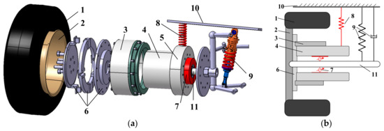 DVA-based electric wheel with outer-rotor motor. (a) Exploded view; (b) Schematic diagram. 1-Wheel; 2-Hub; 3-Motor rotor; 4-Motor stator; 5-Stator extension; 6-Translational pair; 7-In-wheel damper with a controllable actuator; 8-In-wheel spring; 9-Suspension; 10-Sprung mass; 11-Wheel shaft.