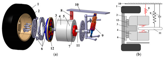 In recent years, electric vehicles (EVs) have entered a new paradigm due to their advantages, compared to vehicles with internal combustion engines (ICEs), in terms of energy efficiency and environmental friendliness [1,2,3,4]. Central motor solutions, which are similar to ICE vehicles and currently dominate the EVs market, are still rather complex due to the number of moving parts. As a result, vehicle developers have been proactively seeking appropriate powertrain solutions for their high-quality EV products [5,6]. By virtue of the development of in-wheel motors (IWMs), the IWM propulsion system has been considered a promising solution to comprehensively improve EVs’ performance. In an in-wheel-motor electric vehicle (IWMEV), the motor, brake, reducer and hub are mounted into the wheel. The highly integrated electric wheel provides great benefits to the vehicle space layout [7], vehicle dynamics control [8], energy conservation [9], and redundant propulsion [10]. Nevertheless, these merits are accompanied with technical challenges. The highly integrated components challenge the design of electric wheels. What is more, the IWMs significantly increase the vehicle unsprung mass. Research shows that removing the propulsion system from the vehicle body to the wheels can increase each wheels’ mass by 30 kg or more [11]. This large unsprung mass shall result in worsened wheel vibration and vehicle vertical performance [12], such as reduction of vehicle ride comfort [13], deterioration of road friendliness [14], reduction of motor reliability under the large wallop [15], and invalidation of suspension control methods [16].
