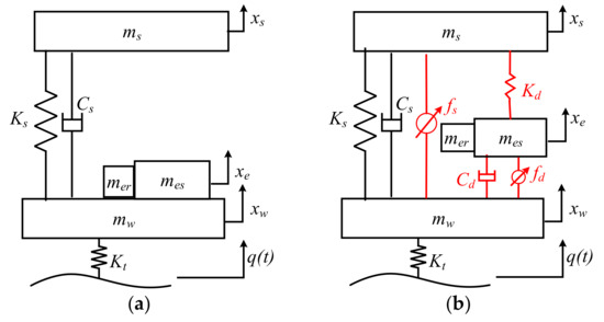 Schematic diagrams of the physical quarter-vehicle models with the conventional electric wheel and the DVA-based electric wheel are shown in Figure 5a,b, respectively. In Figure 5, ms and mw represent the quarter-vehicle sprung mass and wheel mass (including the wheel assembly parts), respectively; mes and mer represent the motor stator mass and rotor mass (including rotor, brake disc and reducer), respectively; Ks and Cs represent the stiffness and damping of vehicle suspension, respectively; and Kt stands for the tire vertical stiffness. Moreover, Cd and Kd represent the stiffness and damping of the proposed DVA, respectively; and fs and fd are the controlled force of the suspension controllable actuator and the DVA controllable actuator, respectively. In addition, xs, xe and xw represent the vertical displacement of the sprung mass, electric motor, and wheel, respectively, and q(t) is the pavement input to the tire. Note that the tire damping is omitted in the models.