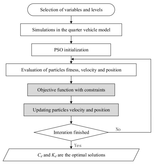 Various parameter optimization methods are developed for vehicle suspension [42,43]. Whereas, most of the existing methods are not very suitable for the in-wheel DVA due to the special structure and the complicated constraints. The particle swarm optimization (PSO) algorithm is a nonlinear global optimization method, which features a fast convergence speed, a good robustness, and the least sensitivity to the number of variables, and is very effective to solve the multi-objective optimization problems with constraint conditions [44]. Thus, the PSO algorithm is adopted to optimize the DVA stiffness Kd and damping Cd.