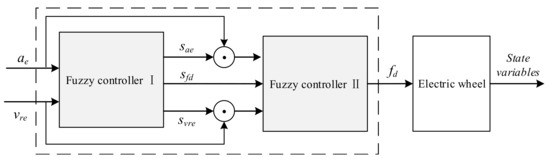 The alterable-domain-based fuzzy method for the DVA actuator force control is designed as shown in Figure 7. The fuzzy controller I is designed to determine the scaling factors of the inputs and outs domains, which takes the motor vertical acceleration ae and the relative vertical velocity vre between the motor and rim as inputs, and takes the scaling factors, the sae for the ae, the svre for the vre, and the sfd for the actuator force fd, as outputs. In the fuzzy controller II, the inputs are the ae and vre with the altered domains and the sfd, and the output is the DVA actuator force fd. The fuzzy rules and parameters of the fuzzy controllers are determined as follows: