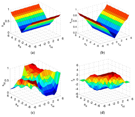 By applying the above settings in comprehensive simulations, we establish the same fuzzy rules for sae and svre as shown in Table 1, the fuzzy rules for sfd as shown in Table 2, and the fuzzy rules for fd as shown in Table 3. The corresponding fuzzy surfaces are shown in Figure 8a–d.