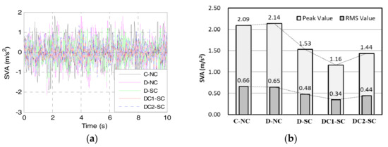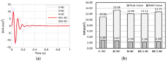 Sprung mass vertical acceleration (SVA). (a) Responses in time domain; (b) Peak value and RMS value.