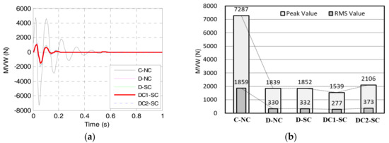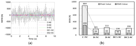 Figure 18 shows the SVA responses of the five electric wheels. Compared with the peak value of C-NC, those of the other electric wheels are even larger, while the RMS values of the other four electric wheels are smaller. Especially, the DVA-based electric wheels converge more stably and quickly than C-NC. We can observe from Figure 19 that the MVW of the DVA-based electric wheels is greatly smaller than that of C-NC, and DC1-SC has the smallest MVW. This demonstrates that the DC1-SC exhibits the best performance on vehicle ride comfort and electric wheel vibration. Figure 20 and Figure 21 show the SDD and TDL responses, respectively. It can be seen that the SDD and TDL of DC1-SC are not the smallest compared with those of the other electric wheels, but they are still maintained in the reasonable values.