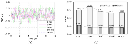 Suspension dynamic deflection (SDD). (a) Responses in the time domain; (b) Peak value and RMS value.