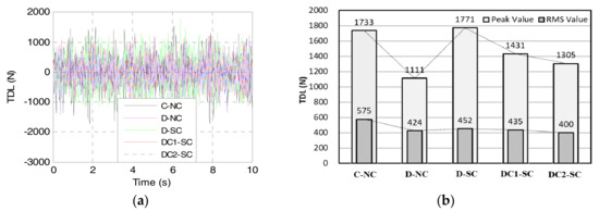 Tire dynamics load (TDL). (a) Responses in the time domain; (b) Peak value and RMS value.