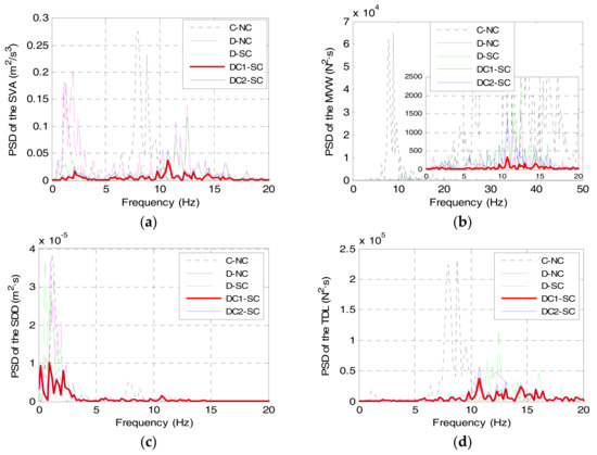Figure 15 shows the power spectral density (PSD) details of the four evaluation indexes responses in the frequency domain. From Figure 15a, we can see that the natural frequencies of the sprung mass and unsprung mass are both increased due to the introduction of the DVA, and the increased frequency-gap between the sprung mass and unsprung mass is beneficial to isolate the vehicle resonance. In addition, at the natural frequency band of the sprung mass (1–2 Hz), we can observe that compared with the SVA of C-NC, that of D-NC is even larger, and that of D-SC, DC1-SC, DC2-SC is much smaller. This indicates that the DVA, to a certain extent, deteriorates the vibration of sprung mass, while this negative effect can be eliminated and optimized by using the LQR-based suspension control.