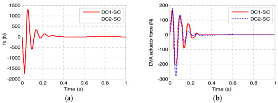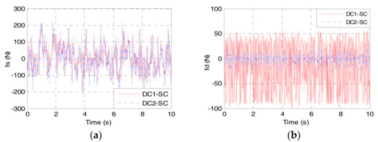 Figure 16 shows the actuator force, including the suspension force and DVA force, in DC1-SC and DC2-SC. The suspension actuator force, shown in Figure 16a, is no much difference between DC1-SC and DC2-SC due to the similar LQR-based suspension control. Whereas, the DVA actuator force, shown in Figure 16b, differs greatly. The above results demonstrate that DC1-SC comprehensively performs better than DC2-SC, which benefits from the alterable-domain-based fuzzy method. It is worthwhile to note that the actuator force includes the noise shown in Figure 10, and the proposed control methods guarantee the good robustness of DC1-SC and DC2-SC.